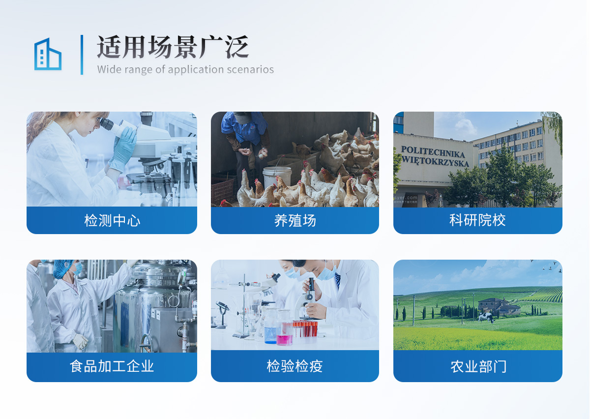 該獸藥殘留檢測(cè)儀為集成化食品安全快速檢測(cè)分析設(shè)備,目前已于食藥監(jiān)局、衛(wèi)生部門(mén)、高教院校、科研院所、農(nóng)業(yè)部門(mén)、養(yǎng)殖場(chǎng)、屠宰場(chǎng)、食品肉產(chǎn)品深加工企業(yè)及檢驗(yàn)檢疫部門(mén)等單位廣泛使用。